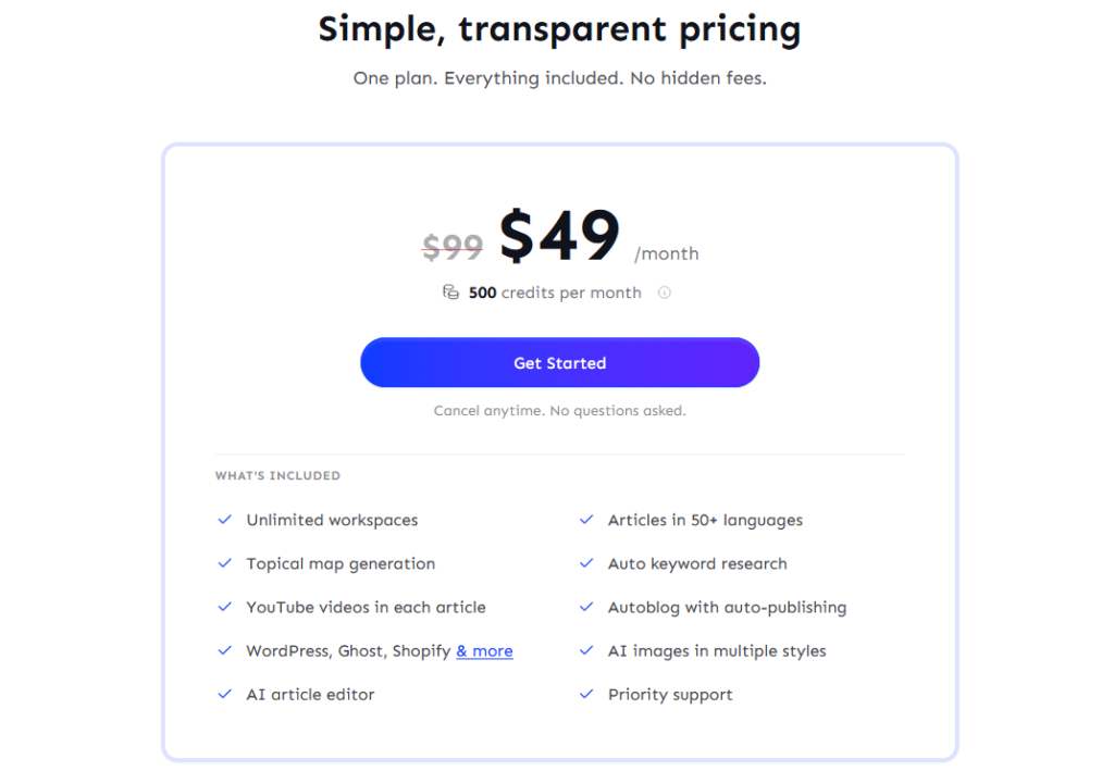Everything is bundled into the single plan: unlimited workspaces, articles in 50+ languages, topical map generation, auto keyword research, YouTube video embedding, Autoblog with auto-publishing, WordPress, Ghost, and Shopify integrations, AI-generated images, an article editor, and priority support. There are no seat limits, no word count caps beyond the credit model, and no feature gating between plans because there is only one plan.